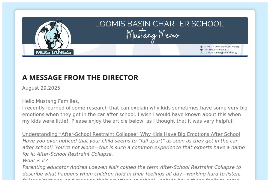 A MESSAGE FROM THE DIRECTOR August 29,2025 Hello Mustang Families, I recently learned of some research that can explain why kids sometimes have some very big emotions when they get in the c. . .